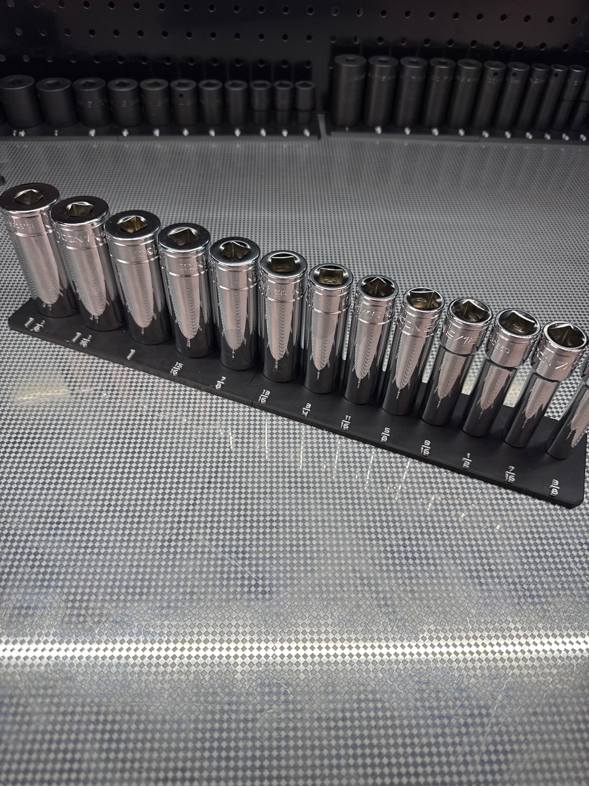 This SAE 1/2 Icon Single Chrome Socket Rail is a must-have for any mechanic or DIY enthusiast. With its single row design, it conveniently holds all your 1/2 Icon chrome sockets in one place. And with customizable color options, you can easily organize and identify your sockets for quicker and more efficient work. Upgrade your tool kit today!